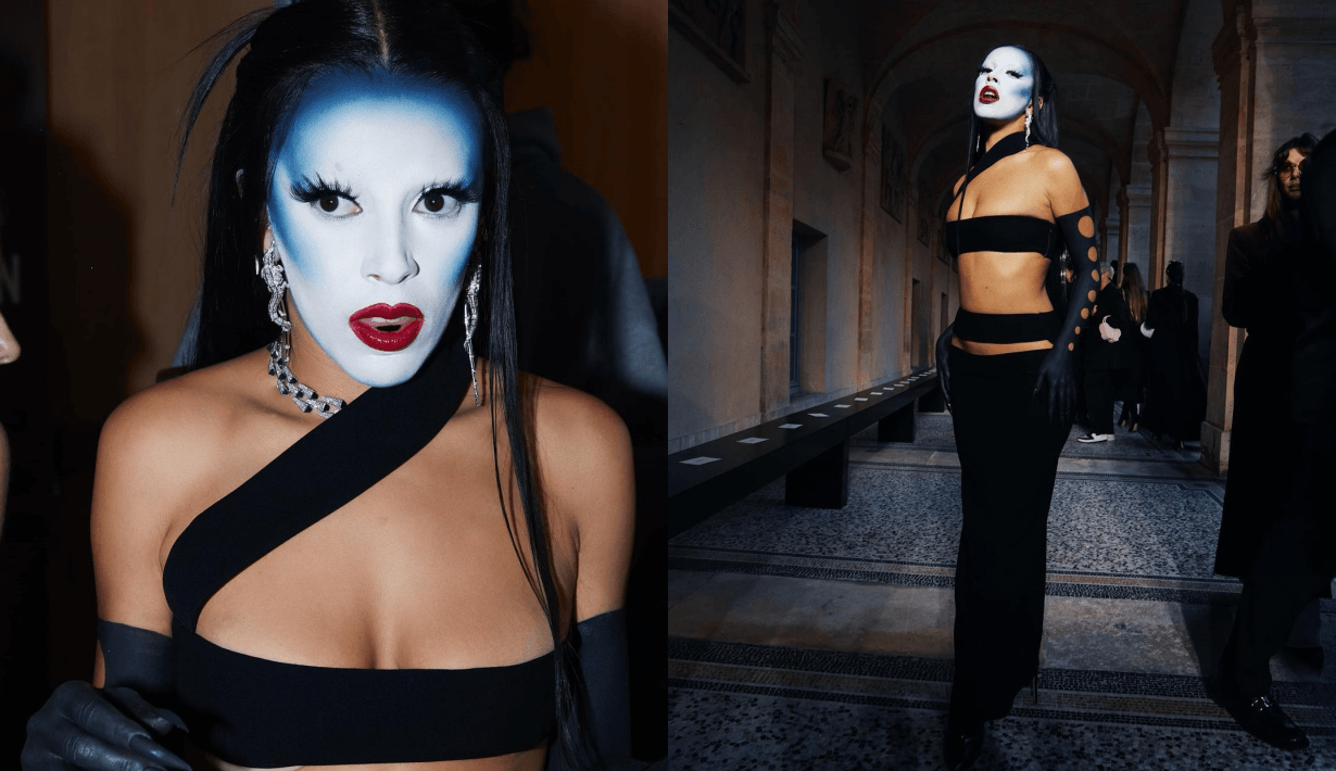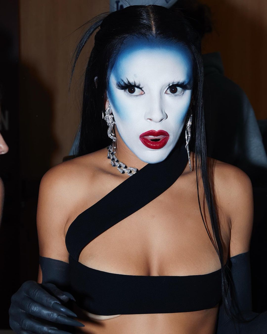 ไม่ว่าจะปรากฎตัวกี่ครั้งก็กลายเป็นกระแสอยู่เสมอ สำหรับแรพเปอร์สาวสุดฮอตอย่าง ‘Doja Cat’ ที่ล่าสุดเธอปรากฎตัวที่งาน Paris Fashion Week เพื่อร่วมชมแฟชั่นโชว์ของ Mônot คอลเล็กชั่น Spring/Summer 2023 โดยมาในเสื้อคล้องคอจับคู่กับกระโปรงสีดำแบบเข้าเซ็ต พร้อมถุงมือยาวสีดำดีเทลคัตเอาท์ แต่สิ่งที่เป็นไฮไลท์ของลุคนี้คือการเพ้นท์หน้าด้วยสีขาวและน้ำเงิน ซึ่งเรียกแสงแฟลชได้อย่างล้นหลาม