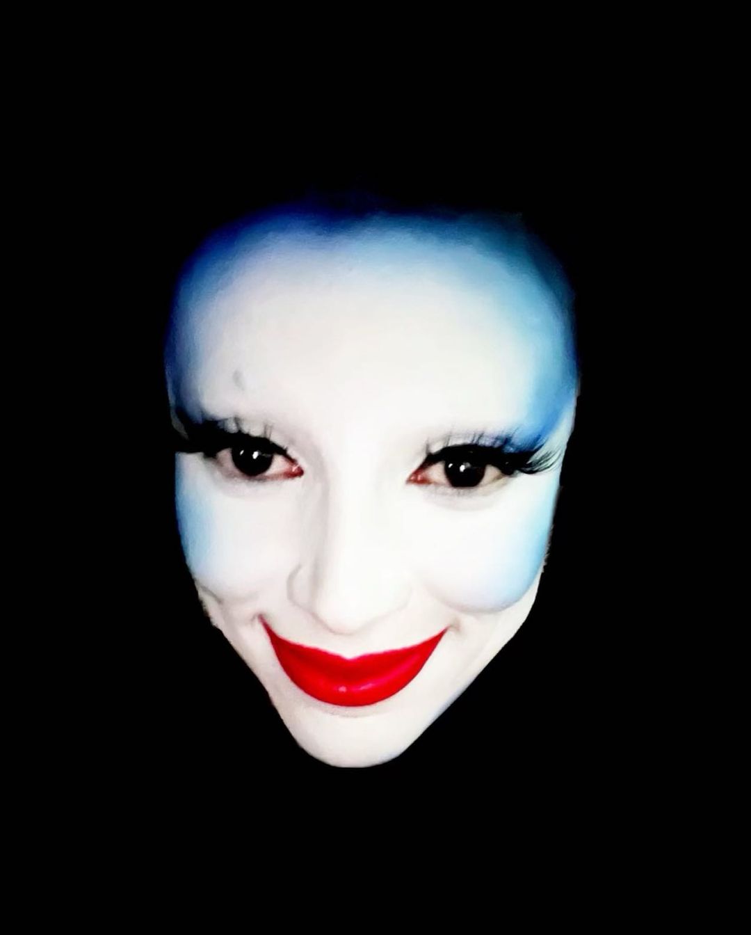 โดยลุคนี้เมคอัพอาร์ทิสต์เลือกลงสีเพ้นท์หน้าสีขาวทั่วใบหน้าแทนการลงรองพื้น จากนั้นจึงใช้อายแชโดว์สีน้ำเงินจาก MAC Art Library Eyeshadow Palette และ Viseart Bright Editorial มาคอนทัวร์กรอบหน้าเพื่อสร้างมิติ พร้อมเซ็ตผิวด้วย Luxury Setting Powder จากแบรนด์ Ben Nye เพิ่มความโดดเด่นให้กับดวงตาด้วยการติดขนตาปลอมสุดสะพรึงจากแบรนด์ Rokael Beauty และปิดท้ายด้วยลิปสติกสีแดงสดจาก Pat McGrath