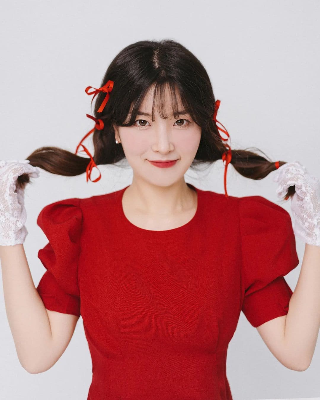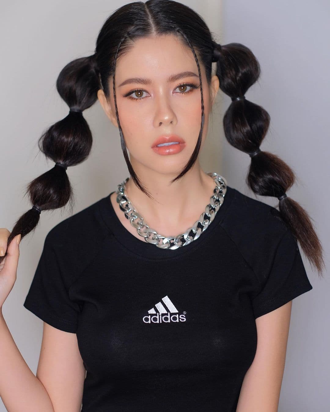 เปิดด้วยผมแกละสไตล์ออริจินัลที่แสกกลาง และมัดเป็นผมหางม้าต่ำ 2 ข้างง่ายๆ แต่จะมีการดึงช่อผมมาพันปิดรอบๆ บริเวณที่มัดเอาไว้ และการม้วนปลายผมให้งุ้มเข้าเล็กน้อย เพื่อเพิ่มกิมมิกไม่ให้ทรงผมดูธรรมดาจนเกินไป รวมถึงยังมีการดึงปอยผมลงมาล้อมกรอบหน้า เพื่อครีเอตลุคน่ารัก พร้อมช่วยให้ใบหน้าเรียวสวยและดูหวานละมุนยิ่งขึ้น