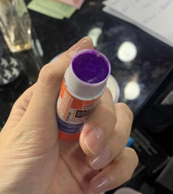1.เตรียมผิวหน้าให้พร้อม ลงสกินแคร์ให้ผิวชุ่มชื้น แล้วเริ่มต้นด้วยไอเท็มชิ้นสำคัญที่ขาดไม่ได้ในการแต่งแดร็กคือกาวแท่งสีม่วง ไม่ว่าจะแดร็กควีนชาวไทยหรือต่างชาติล้วนมีกาวแท่งสีม่วงนี้ติดโต๊ะเครื่องแป้งตลอด โดยจะลงตามแนวขนตั้งแต่หัวคิ้วถึงหางคิ้ว